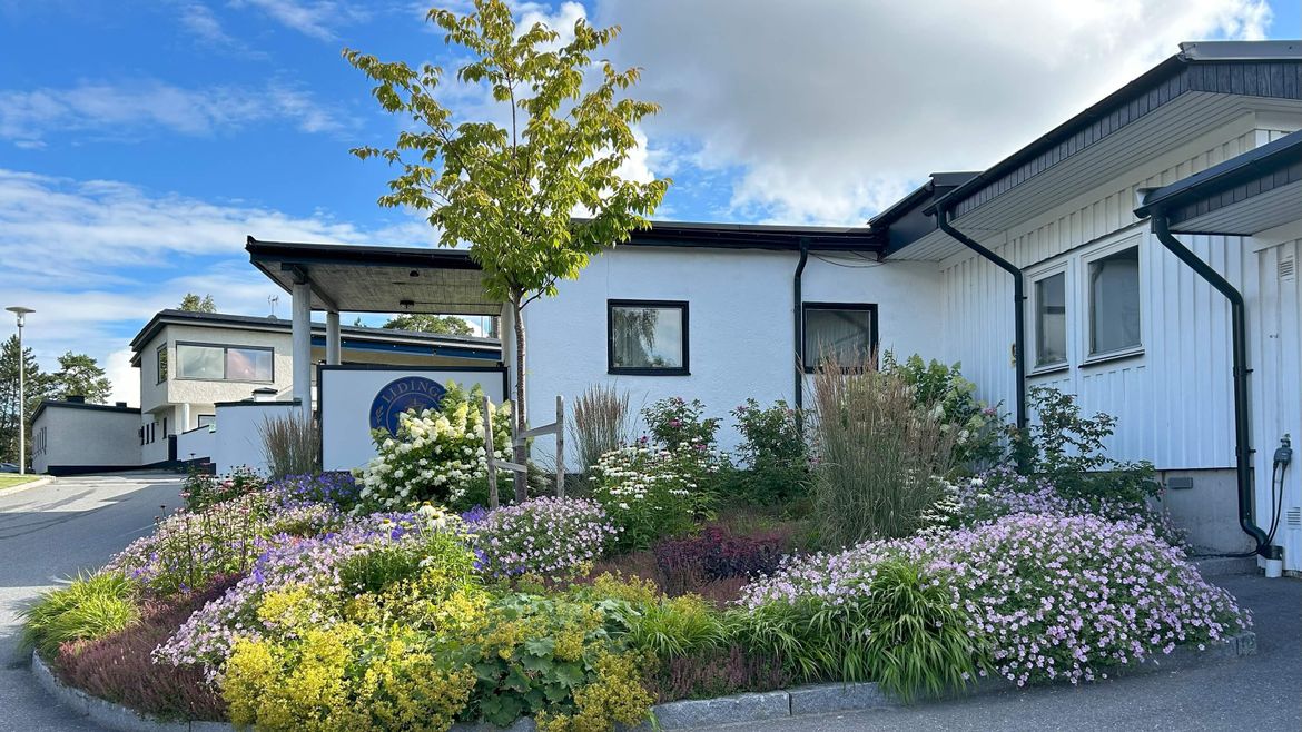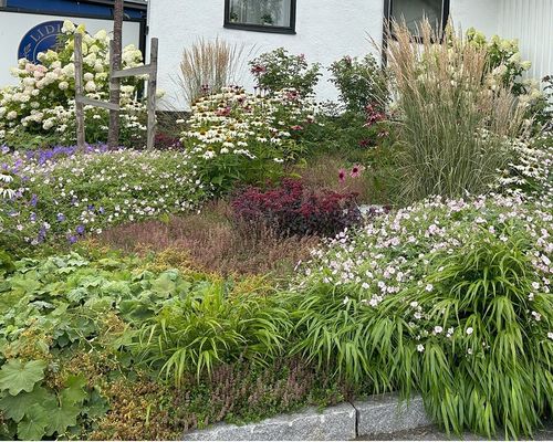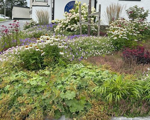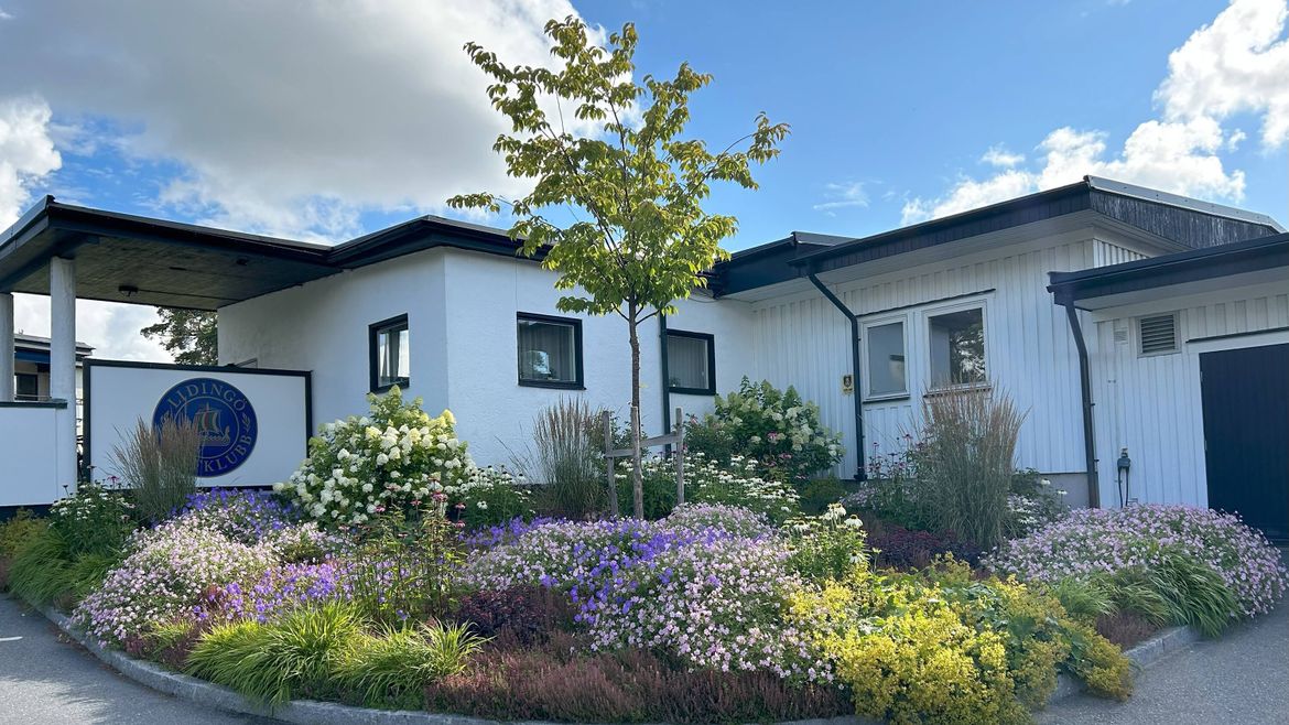 Golfklubbens första intryck var lite stökigt och oharmoniskt. Vi skissade på ett förslag där golfbollar och peggar blev en rolig detalj. Det färdiga resultatet blev en böljande färgsprakande rabatt med mycket bollform.