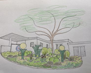 Här har vi jobbat med klotformer och mycket färg. “Peggarna”, som består av idegranspelare, har under ett par säsonger beskurits för att få den rätta formen. Ovanpå dessa har klotformade lampglober placeras för att symbolisera golfbollar. Lekfullt och något som verkligen ger karaktär till just den här platsen. Ett bergskörsbär breder ut sig ovan planteringen vilket skapar ett tak och ramar in.