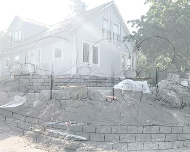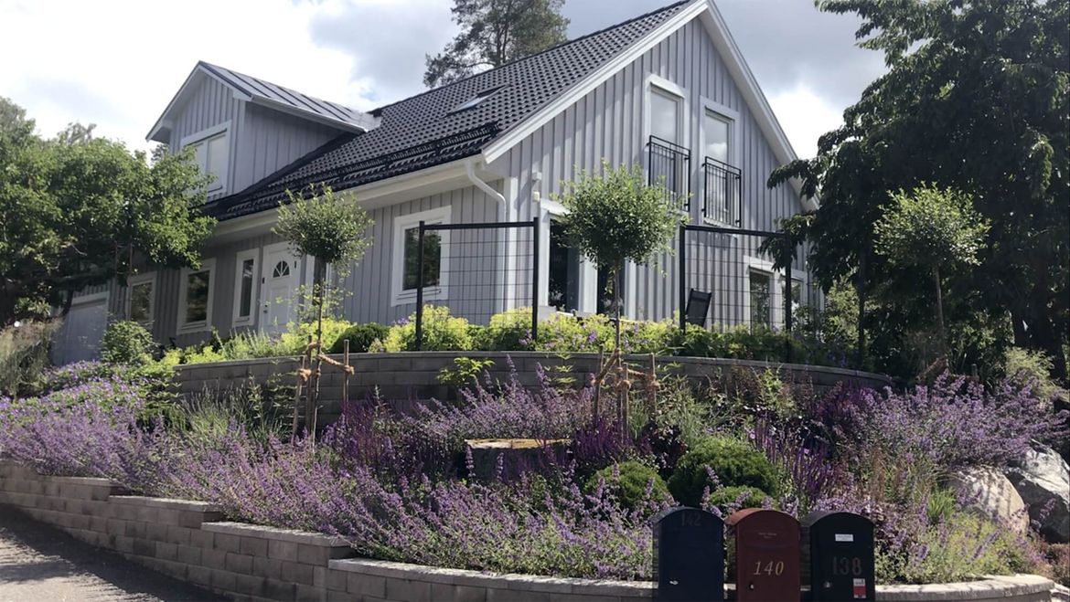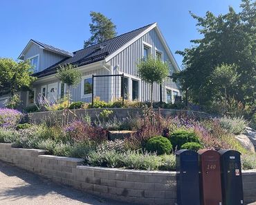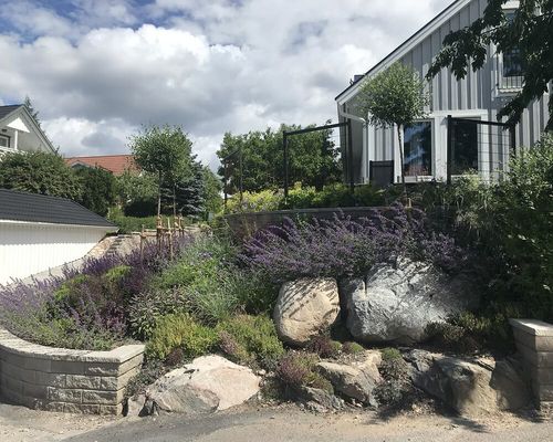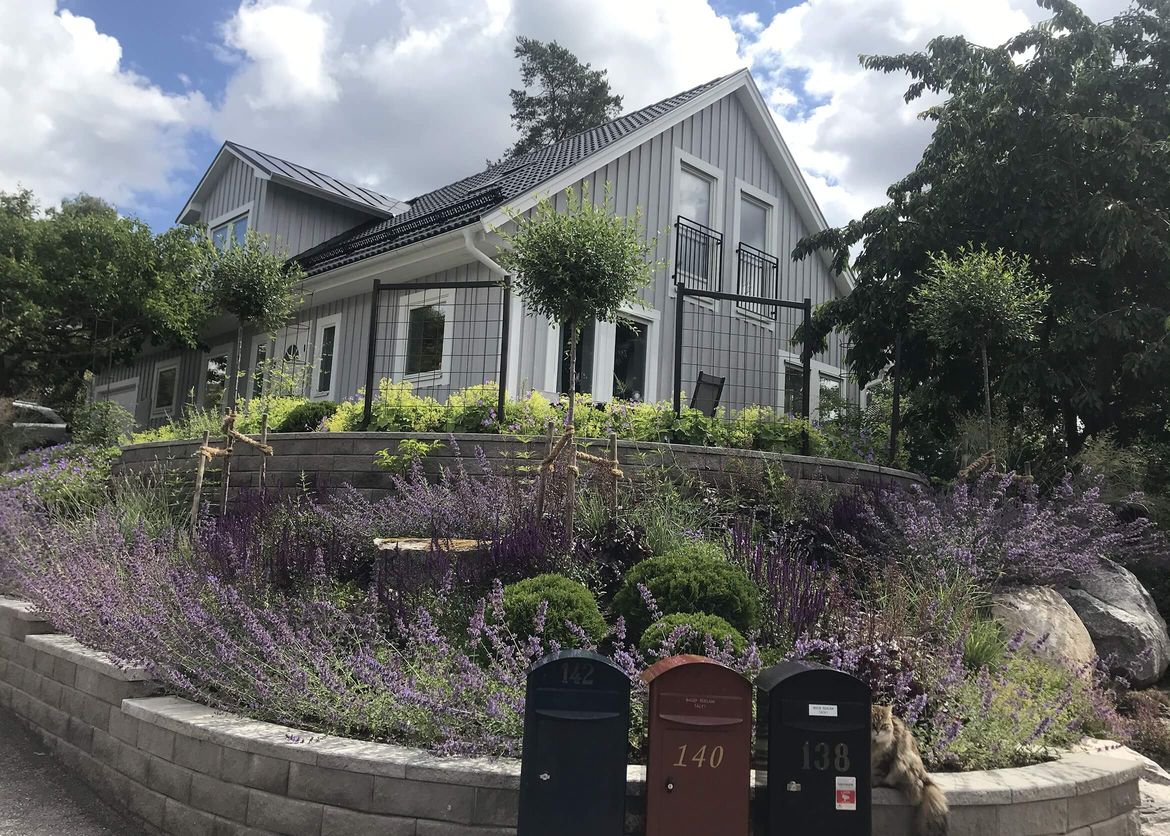 Gamla 70-80-tals-växter hade blivit vildvuxna och för stora. Familjen ville ha en vacker entré men även en sittplats, då bästa kvällssolen fanns i detta hörn av tomten. I samband med skapandet av denna plantering åkte Erika på trädgårdsresa till Nice och Provence. Resan gav så mycket inspiration! – Här skulle det dofta Sydfrankrike! Resultatet blev en prunkande slänt i etage där insekterna surrar bland nepeta, lavendel och timjan. Färgerna går i framför allt blålila men även rosa, lime och mörkt lila. Sittplatsen längst upp ramades in och insynsskyddades av platsbyggda växtstöd med klättrande vingfröranka, dessa ska påminna om vinodling.